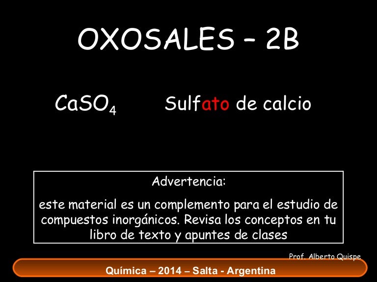 Sal de mesa Nombre. La sustancia CaSO4 corresponde a sulfato de calcio la cual es una sal compuesta por un átomo de calcio cargado positivamente es un alcalinotérreo y posee dos electrones en su capa de valencia que son donados directamente hacia los átomos electronegativos y el anión sulfato los átomos de oxígeno no unidos mediante enlace doble -sino mediante enlace simple- con el. Es la fórmula que se utiliza para denotas el sulfato de calcio un compuesto químico utilizado de manera industrial o laboratorio es el comúnmente conocido como YesoSus caracteristicas son. Sulfato IV de sodio o sulfito. Por ejemplo está bien escrito cloruro de cobreII y mal escrito cloruro de cobre II.