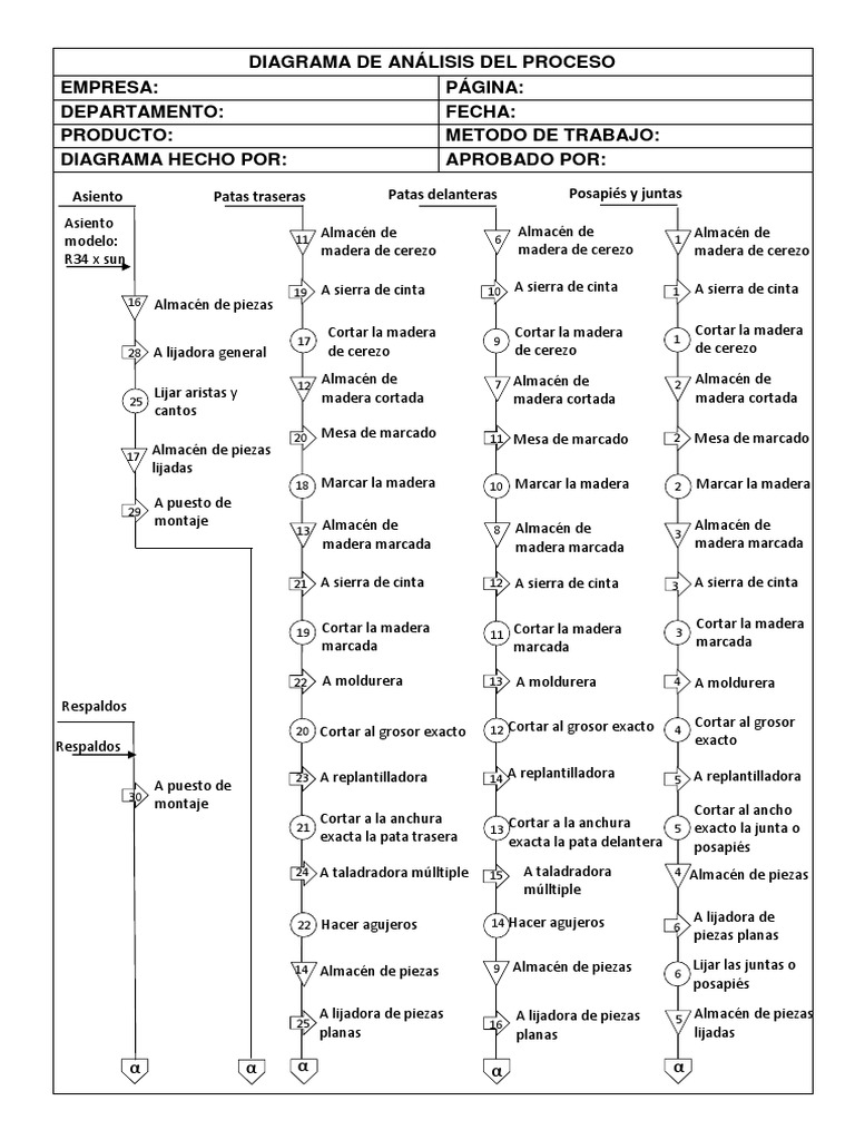 Diagrama De Operaciones De Una Silla. DIAGRAMA DE OPERACIONES DEL PROCESOPROCESO PROCESOELABORACION DE UNA SILLA METODOACTUAL INICIOMADERA ANALISTAOMAR TERMINOALMACEN HOJA11 CABESALES DE SILLA PARANTES Y PATAS DE SILLA MADERA 9 1 MADERA SEPILLADO 2 SEPILLADO MARCADO PARA LOS CORTES 3 CORTADO DE ANCHO DE LAS PATAS 1 Circular CORTADO. Diagrama de anÁlisis del proceso. Enviar por correo electrónicoEscribe un blogCompartir con TwitterCompartir con FacebookCompartir en Pinterest. Este diagrama nos enseña una sucesión cronológica de todas las operaciones de taller o en máquinas inspecciones márgenes de tiempo y materiales a utilizar en un proceso de fabricación o administrativo desde la llegada de la materia prima hasta el empaque o arreglo final del producto terminado. Un Diagrama de Operaciones del Proceso es una representación gráfica de los puntos en los que se introducen materiales en el proceso y del orden de las inspecciones y de todas las operaciones Excepto las incluidas en la manipulación de los materiales.