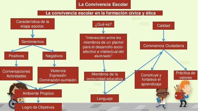Publicación de las normas. Convivencia escolar La convivencia escolar debe estar basada en valores como el respeto la tolerancia compromiso responsabilidad para generar un ambiente adecuado donde se adquieran aprendizajes significativos para la vida cierto es que cada individuo piensa y tiene ideologías diferentes pero al interactuar día a día con las de. MAPA CONCEPTUAL CONVIVENCIA PACIFICA Y DEMOCRATICA EN EL CONTEXTO ESCOLAR APROXIMACIÓN A LA EDUCACIÓN PARA LA PAZ Necesidad de educar para la convivencia punto de partida y meta problemas de convivencia mejorar el mundo Principios de la educación para la paz el cultivo de los valores aprender a vivir con los demás. Los centros que comenzaron en un primer año el proceso de elaboración del plan de convivencia siguiendo como eje lo que establecía la guía del departamento y dentro hasta junio de 2010 de una de las líneas prioritarias se encuentran en. Mejora al aprendizaje en lectura escritura y matemáticas.